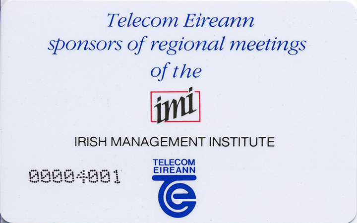 All of the 50u IMI Callcards were given out at the IMI conference in Killarney in May 1989. With Telecom Eireann sponsoring the event, the cards were given to attendees as a complementary gift, but because the Autelca cards were part of a trial system (and would only function on the 31 Phones installed around Limerick), most of them were thrown away. Rumor has it that the remaining 50 unit cards were disposed of by the hotel that hosted the conference. These are extremely hard to come by, more so than the 20 unit version (with a lower production run) because they were only ever in the hands of attendees and most have been disposed off or lying tattered in the bottom of businesses filing cabinets.