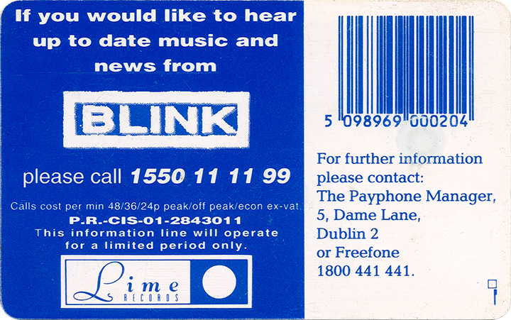 Advertising Callcard for Irish band "Blink". A number of these Callcards were used as a membership cards for the band's fanclub.