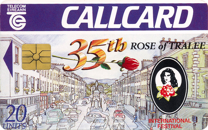 This Callcard celebrates the 35th anniversary of the Rose of Tralee Festival in 1993. The picture depicts Denny Street in the town of Tralee, where the festival takes place each year.