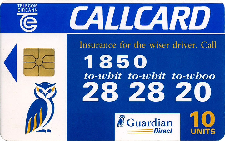 Advertising Callcard for Guardian Direct insurance, featuring their distinctive owl logo and their owl themed telephone number