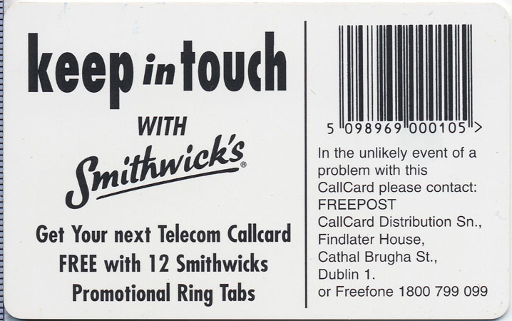 Promotional Callcard advertising Smithwick's Irish Stout. This Callcard could also be obtained for free by collecting 12 Smithwick's promotional ring tabs