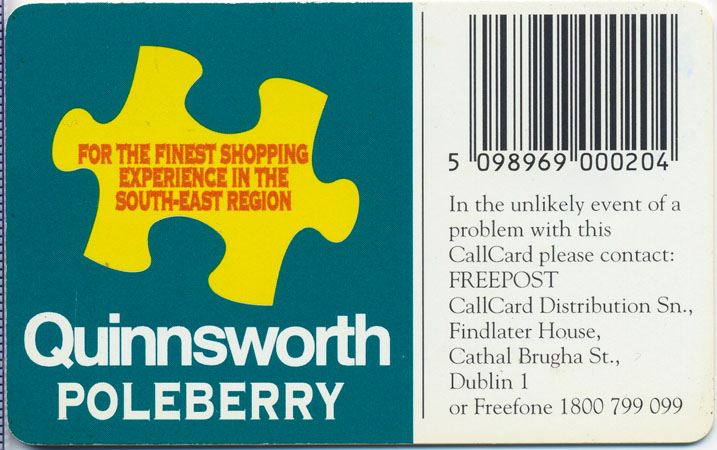 Callcard issued by Quinnsworth to promote their new Shopping Centre at Poleberry in Waterford. The Callcard was mainly available in the Waterford area.
