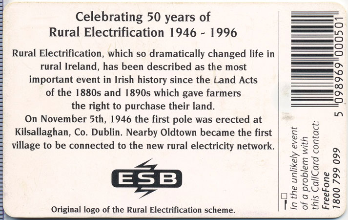 Issued to commemorate the 50th anniversary of rural electrification in Ireland by the ESB. The image on the Callcard shows the erection of the first rural electricity pole at Kilsallaghan, Swords, Co. Dublin.