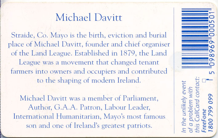 Callcard commemorating the birth of Michael Davitt, founder and chief organiser of the Land League in Ireland