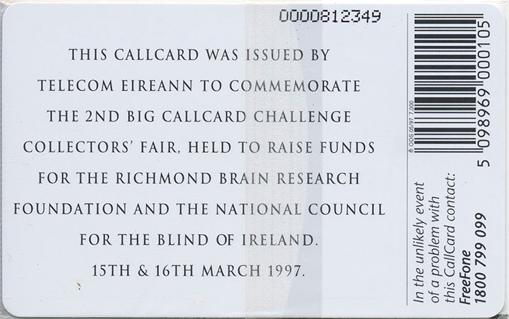 Callcard released at the 2nd International Callcard fair held on the 15th & 16th of March 1997. All proceeds in aid of the Richmond Brain Research Foundation and the National Council for the Blind of Ireland.
