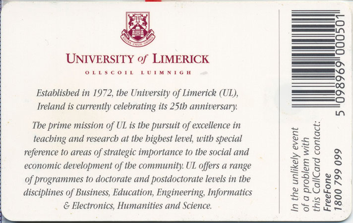 Callcard issued to celebrate the 25th year of the University Of Limerick.