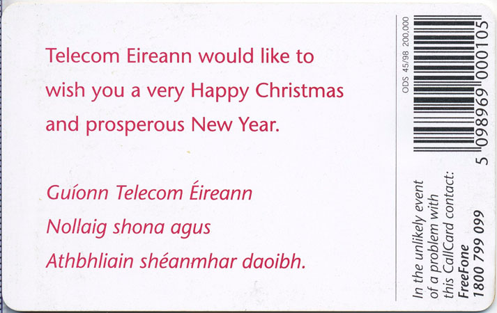 The 1998 Christmas Callcard was tied in with Telecom Eireann's Christmas advertising campaign. For IR£7.00, you could purchase the General (1226) and special edition Christmas 1998 (1227) Callcards in an exclusive Collectors Club Pack shown.