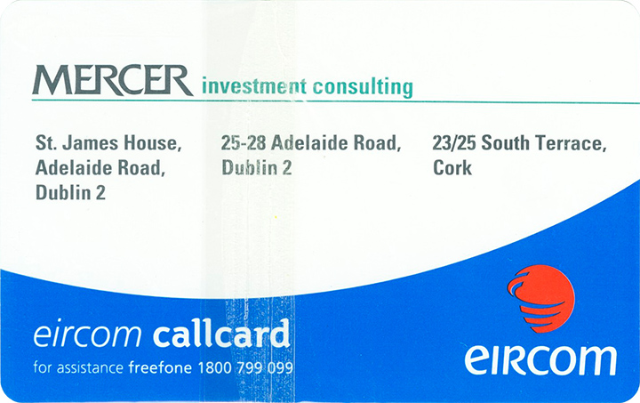 Callcard issued to promote specialist services offered by Mercer Investment Consulting.