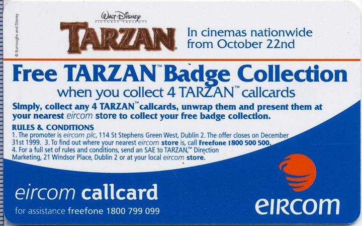 A unique promotion was developed to launch these Callcards. Customers who collected any 4 promotional Tarzan Callcards received a free Tarzan Badge set which was instantly redeemable at all eircom stores until 31 December 1999.