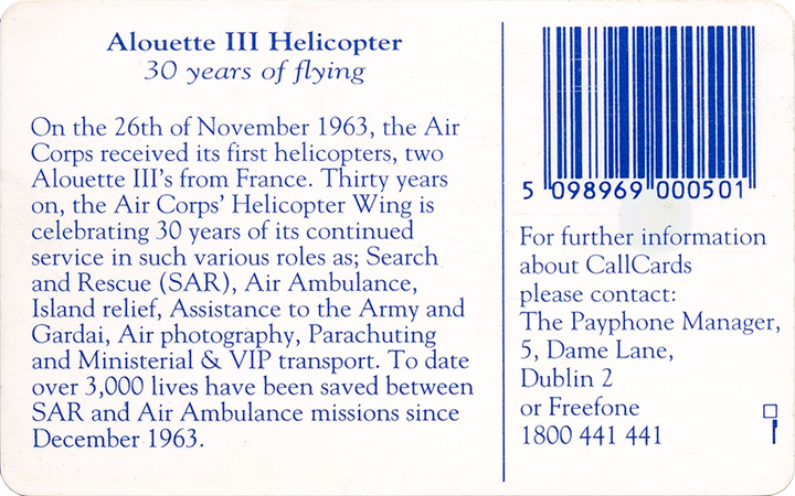 Callcard commemorating the Alouette III Helicopters' 30 years of service with the Irish Air Corps. A special pack was issued to raise money for the Museum Fund. The pack was limited to 195 copies and was sold for between IR£25 - IR£75. This contained a mint Callcard and a card signed by the pilot. The cards were flown in Helicopter 195 on a misson from France to Baldonnel. They were available from the Irish Air Corps.