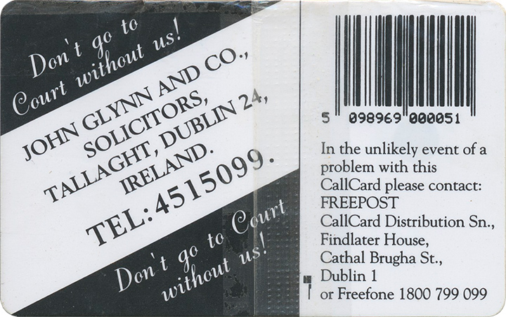 This Callcard was given to new clients of John Glynn Solicitors, once a new client case was opened. 4,500 of the remaining Callcard were sold at £3 each through the Telecom Eireann Callcard Collectors Club with a limit of one per person.