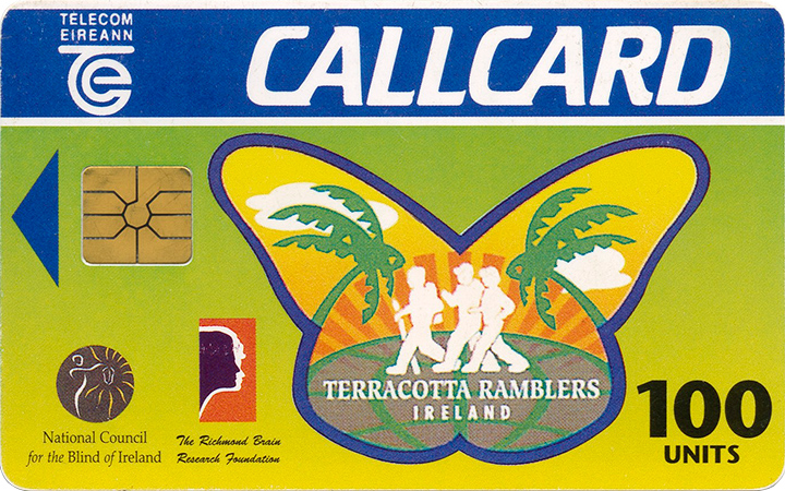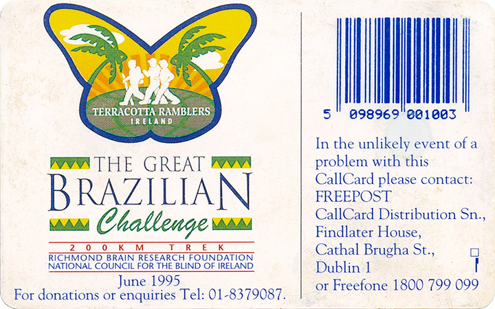 Callcard issued to commemorate the largest overseas fundraising event, the great Brazilian Challenge. This was a 200km trek in the rain forest of the Amazon Basin in Brazil in aid of the Richmond Brain Research Foundation and the National Council for the Blind of Ireland.