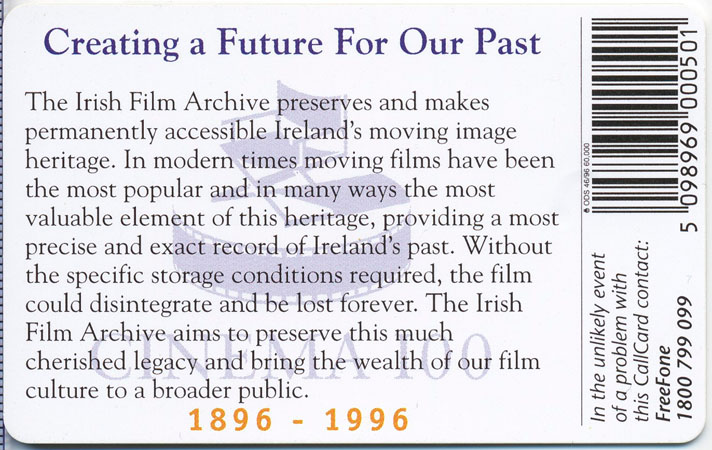 Callcard Issued for the Irish Film Archive to commemorate the 100th anniversary of the first film screening in Ireland. The card shows a scene from the movie Michael Collins, starring Liam Neeson and directed by Neil Jordan.
