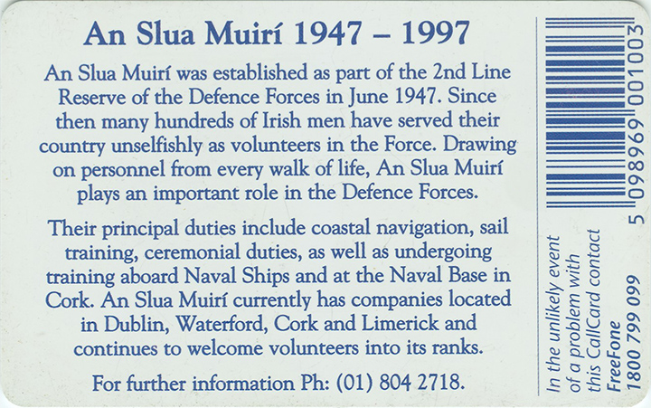 This CallCard was released in 1997 to mark the 50th Anniversary of an Slua Muirí, the 2nd line reserve of the Irish Defense Forces.