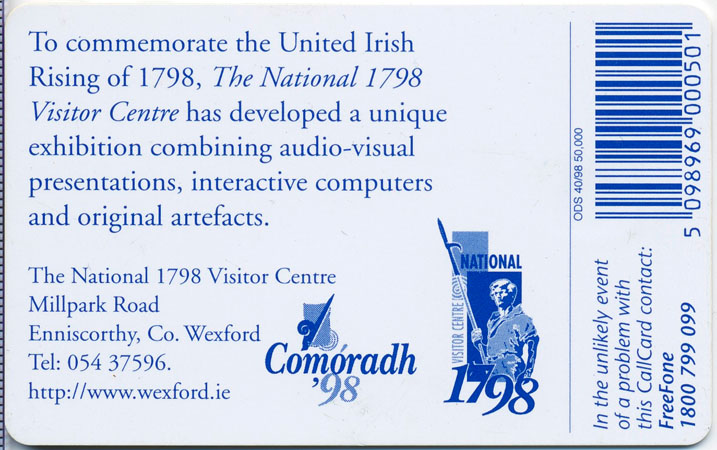 Callcard issued for the bicentenary commemoration of the United Irish Rising of 1798 and to promote the 1798 Visitor Centre in Enniscorthy, Co. Wexford.