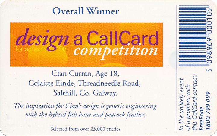 Cian Curran, aged 18, from Colaiste Einde in Salthill was the winner of the fourth national Design a Callcard competition in 1998. His illustration was chosen from over 23,000 entries.